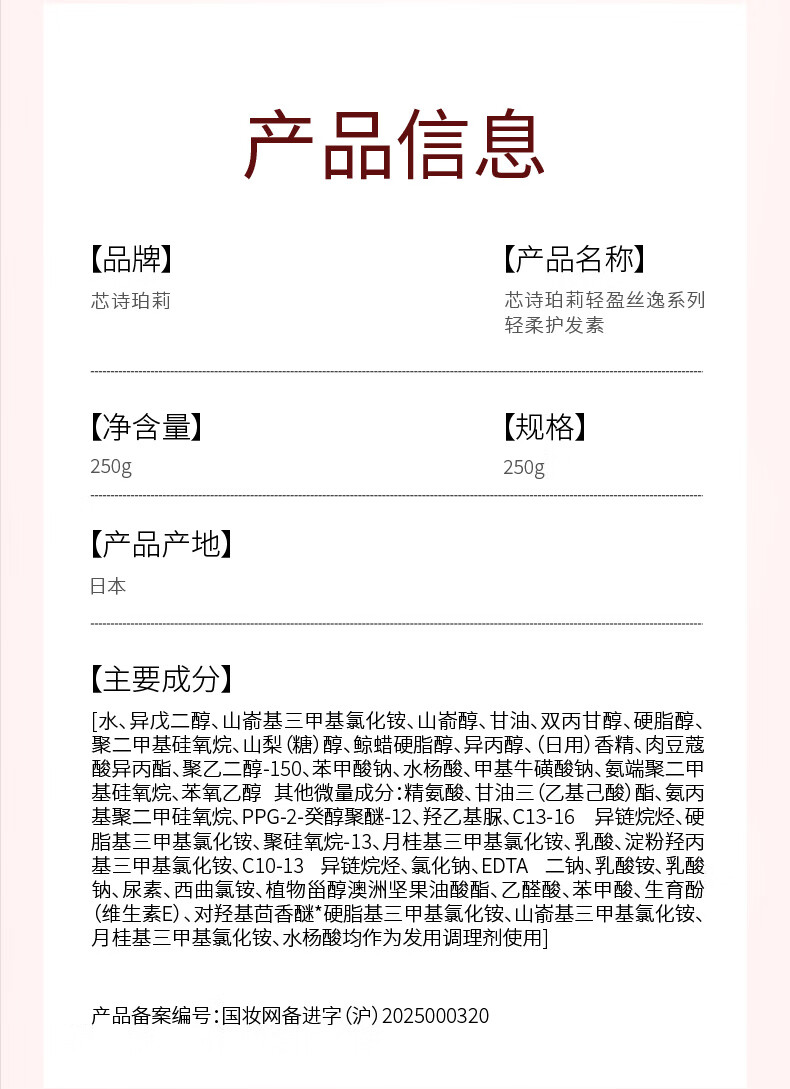 商品名称:(世星阳光)资生堂 专业美发芯诗珀莉轻盈丝逸系列 轻柔护发素 250g 柔软顺滑抵御卷翘 发丝轻盈柔软顺滑